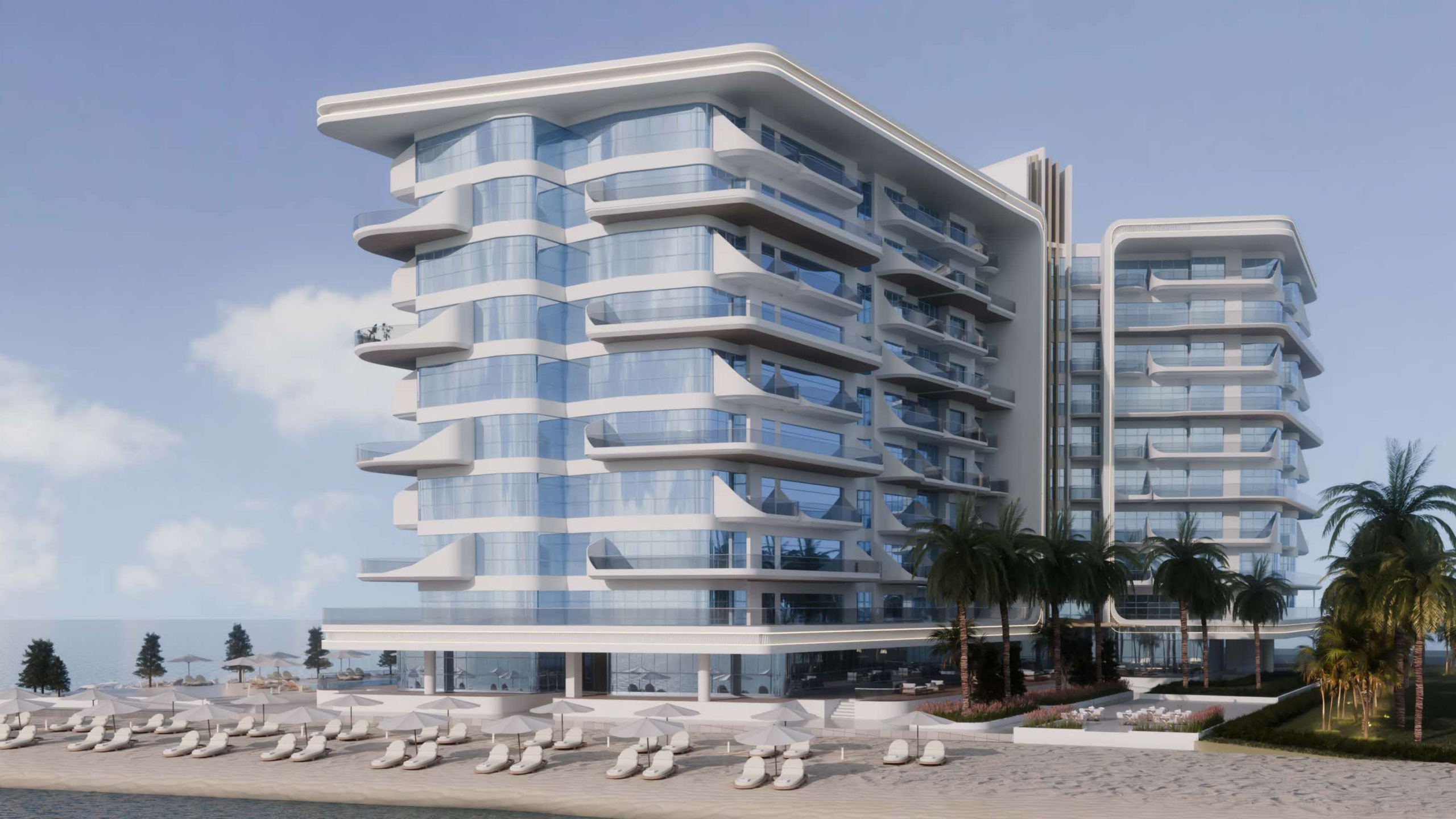 Unit Types: Over 100 fully furnished apartments in 1, 2, and 3-bedroom layouts, each with spacious terraces and sea views.